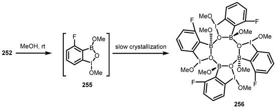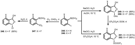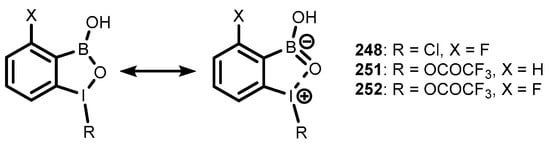 - Nemykin, V.N.; Maskaev, A.V.; Geraskina, M.R.; Yusubov, M.S.; Zhdankin, V.V. Preparation and X-Ray Crystal Study of Benziodoxaborole Derivatives: New Hypervalent Iodine Heterocycles. Inorg. Chem. 2011, 50, 11263–11272. [Google Scholar] [CrossRef]