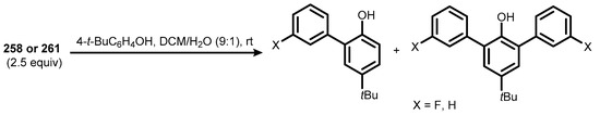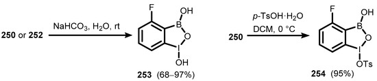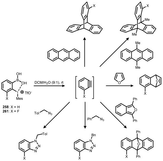 - Yoshimura, A.; Fuchs, J.M.; Middleton, K.R.; Maskaev, A.V.; Rohde, G.T.; Saito, A.; Postnikov, P.S.; Yusubov, M.S.; Nemykin, V.N.; Zhdankin, V.V. Pseudocyclic Arylbenziodoxaboroles: Efficient Benzyne Precursors Triggered by Water at Room Temperature. Chem. Eur. J. 2017, 23, 16738–16742. [Google Scholar] [CrossRef]