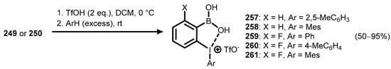 Synthesis of ortho-(alkoxysilyl) arylboranes (58–59) featuring dative Si-O(i-Pr)→B linkage.
