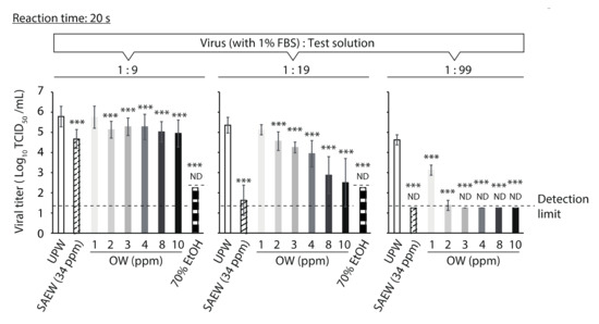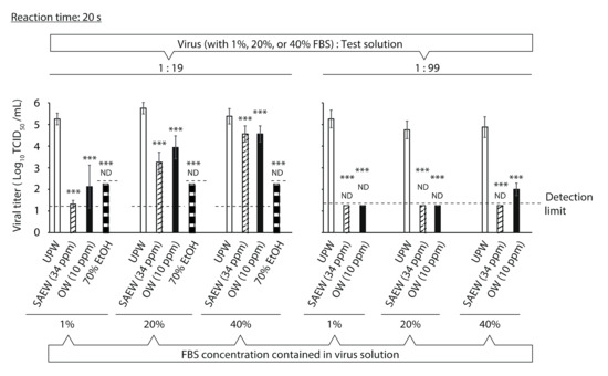 Comparison of virucidal activities of slightly acidic electrolyzed water (SAEW), ozonated water (OW) and 70% ethanol (EtOH). The viral titer of each reaction mixture was measured. Results are indicated as mean ± standard deviation (n = 3–30 per group). The detection limits of the viral titer are 1.25 log10 50% tissue culture infective dose (TCID50)/mL in the ultra-pure water (UPW), SAEW and OW groups, and 2.25 log10 TCID50/mL in the 70% EtOH group. ND is the abbreviation for not detected, which means that the viral titer was below the detection limit. Student’s t-test was performed to analyze the statistical significance between the UPW (control) group and each test solution group; *** p < 0.001. FBS, fetal bovine serum.