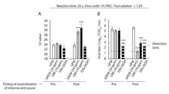 Evaluation of the impact of test solutions on the SARS-CoV-2 genome. (A) The cycle threshold (Ct) value of each reaction mixture was measured. (B) The viral titer of each reaction mixture was measured. The detection limits of the viral titer are 1.25 log10 50% tissue culture infective dose (TCID50)/mL in the ultra-pure water (UPW), slightly acidic electrolyzed water (SAEW) and ozonated water (OW) groups, and 2.25 log10 TCID50/mL in the 70% ethanol (EtOH) group. ND is the abbreviation for not detected, which means that the viral titer was below the detection limit. (A, B) Results are indicated as mean ± standard deviation (n = 4 per group). Student’s t-test was performed to analyze the statistical significance between the UPW (control) group and each test solution group; *** p < 0.001. Pre indicates that Na2S2O3 was added to each test solution before mixing with the virus solution; Post indicates that Na2S2O3 was added 20 s after mixing with the virus solution. FBS, fetal bovine serum.