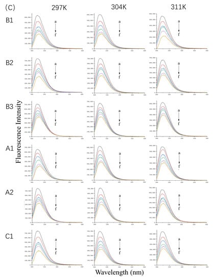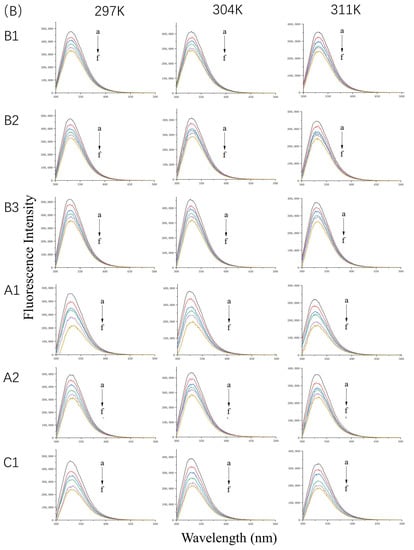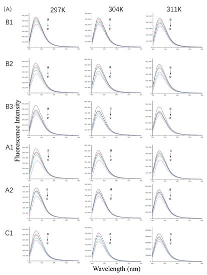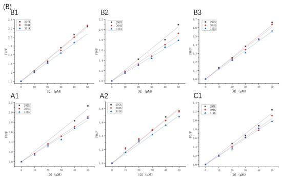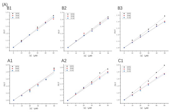 The fluorescence emission spectra of β-LG and α-LA at 297 K, 304 K, and 311 K in the absence or presence of proanthocyanidins are shown in Figure 1B,C. The maximum quenching rate was observed at a molar ratio (i.e., protein-to-proanthocyanidin ratio) of 1:5 at 297 K. For β-LG, the quenching rate of A1, A2, B1, B2, B3, and C1 was 47.5%, 36.24%, 31.16%, 30.30%, 32.73%, and 49.67%, respectively. For α-LA, the quenching rate of A1, A2, B1, B2, B3, and C1 was 53.07%, 53.34%, 55.33%, 52.26%, 39.82%, and 55.32%, respectively, which is higher than that for β-LG. The data illustrate strong interactions between β-LG/α-LA and the six proanthocyanidins. Moreover, the proanthocyanidins quenched more fluorophores in α-LA than in β-LG. As the concentration of proanthocyanidins increased, the λmax of β-LG showed a slight red shift of about 2 nm. The shift may have been associated with the microenvironmental changes of Trp19, located in the hydrophobic inner cavity, contributing to 80% fluorescence intensity [15]. In contrast, the λmax of α-LA shifted from 322 nm to about 328 nm, which indicates that the microenvironment near Trp residues of α-LA became more hydrophilic [16].
