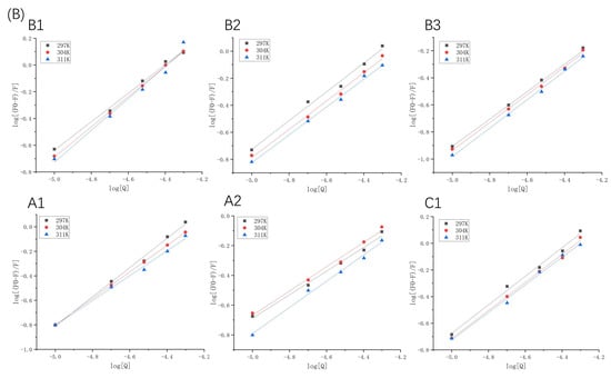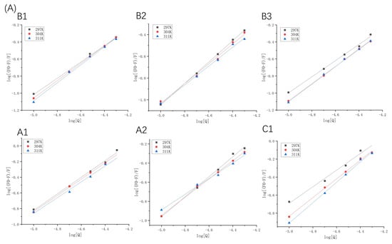 Double logarithmic Stern–Volmer plots of β-LG (A) or α-LA (B) quenched by proanthocyanidins A1, A2, B1, B2, B3, and C1 at 297 K, 304 K, and 311 K.