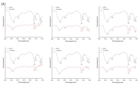 FTIR of the samples was performed using a Nicolet 6700 IR infrared spectrometer (Thermo Scientific, Waltham, MA, USA). The protein–proanthocyanidin mixture (molar ratio of 1:5), individual proanthocyanidin (B1, B2, B3, A1, A2, and C1), and protein (β-LG and α-LA) solutions were prepared in PBS (10 mM, pH 6.3) and then freeze-dried for 30 h by Vacuum Freeze Dryer-2000 (Bilon, Shanghai, China). The freeze-dried powder was blended with KBr at a mass ratio of 3:100 and pressed to form tablets for further measurement. The spectra were recorded in absorbance mode between 400 and 4000 cm−1 at a resolution of 4 cm−1, and 16 scans were performed using the Nicolet Omnic v8.0 software (Thermo Nicolet Corporation, Waltham, MA, USA). The baselines were corrected automatically. The infrared difference spectra were recorded by subtracting the spectra of the PBS solution from those of the protein solution or by subtracting the spectra of the proanthocyanidin solution from those of the protein–proanthocyanidin mixture solution.