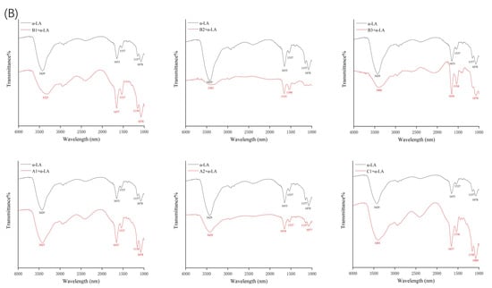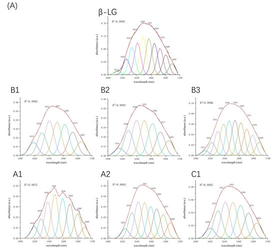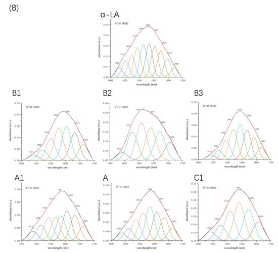 Fourier-transform infrared spectroscopy (FTIR) was used to determine the changes in the secondary structure of proteins caused by the formation of the protein–procyanidin complex. The protein FTIR spectra exhibit amide bands that represent vibrations in peptide moieties. Both spectral shape variations and shifting for amide I band (1700–1600 cm−1, C=O peptide bond) and the amide II band (1600–1500 cm−1, N-H bending and C-N stretching) [28,29] are extremely useful for the identification of secondary structural changes of the protein. As shown in Figure 4A, β-LG shows two major peaks in the 1700–1500 cm−1 regions, with amide I at 1650 cm−1 and amide II at 1539 cm−1. The amide I of β-LG shifted to 1645 cm−1 after combining with A1, A2, B1, and B2; to 1646 cm−1 after combing with C1; and to 1651 cm−1 after combining with B3. Moreover, amide II shifted to 1543 cm−1, 1543 cm−1, 1542 cm−1, 1540 cm−1, 1542 cm−1, and 1543 cm−1, respectively, after combining with A1, A2, B1, B2, B3, and C1. These changes disturbed the secondary structure of β-LG due to binding with proanthocyanidins. In the case of α-LA, even though no obvious change was observed in the position of the peaks after the addition of proanthocyanidins, the alterations in the shape of the amide I and amide II bands were observed (Figure 4B), indicating the changes in the protein secondary structure. To determine the detailed information regarding the changes in the secondary structure of two proteins, Peakfit software was used to separate overlapping peaks and perform fitting calculations [30]. The components of the amide I band were assigned as reported [31]: β-sheet (1613–1637 cm−1, 1682–1689 cm−1); random coils (1637–1645 cm−1); α-helix (1645–1662 cm−1); and β-turn (1662–1682 cm−1) (Figure 5). The relative percentage of secondary structural elements in the absence and presence of proanthocyanidins was calculated (Table 3). The data suggest that proanthocyanidins induced more pronounced conformational changes in α-LA than β-LG, which is consistent with the binding affinity obtained from fluorescence spectral analysis.