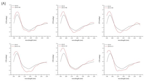 Secondary structure analysis for β-LG/α-LA and its complexes with A1, A2, B1, B2, B3, and C1 by the CD method.