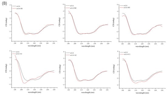 Far ultraviolet CD spectra of β-LG (A) or α-LA (B) (10 µM) with proanthocyanidin A1, A2, B1, B2, B3, and C1 (50 µM).