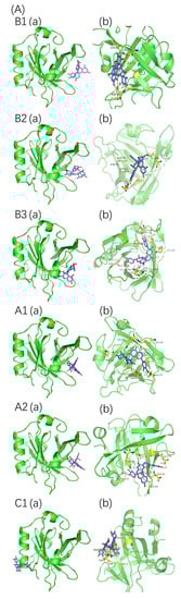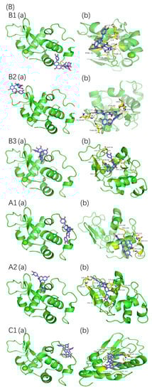 Molecular docking results of proanthocyanidins A1, A2, B1, B2, B3, and C1 with β-LG (A) or α-LA (B). (a) Best conformation for proanthocyanidins with proteins; (b) binding sites in detail. The interaction of amino acid residues with proanthocyanidins are shown in yellow.