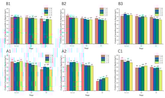 The stability of proanthocyanidin A1, A2, B1, B2, B3, and C1 with WPI at molar ratios of 1:0, 1:1, 1:2, and 1:4. GD: gastric-digested; ID: gastrointestinal-digested. Different lowercase letters indicate that there are significant differences in the same stage of samples at different molar ratios, p < 0.05. Different uppercase letters indicate that there are significant differences in the different stage of samples at the same molar ratio, p < 0.05.