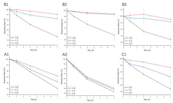 The storage stability of proanthocyanidin A1, A2, B1, B2, B3, and C1 with WPI at room temperature. The molar ratios of proanthocyanidin:WP are 1:0, 1:1, and 1:4, respectively.
