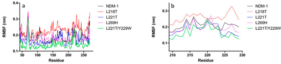 In order to evaluate the role of substitutions for L218T, L221T, L269H and L221T/Y229W in NDM-1 (PDB code: 5ZGZ), a 20 ns of molecular dynamics simulations (MDs) was performed. Since protein stability is required for post-processing analysis, the root-mean-squared deviations (RMSD) of protein backbone atoms were monitored as a function of simulated time (Figure S3). All enzymes were quite stable. The root-mean-square fluctuations (RMSF) analysis highlighted two intense peaks in NDM-1 structure, characterising L3 (65–71) and L10 (209–229) residues (Figure 1a,b).