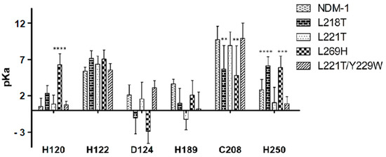 pKa values of the first sphere of coordination between NDM-1 and mutants calculated at pH 7. ** p = 0.003, *** p = 0.0003 and **** p < 0.0001, significantly different from NDM-1 by ANOVA test.