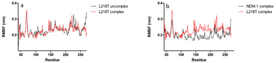 Evaluation of NDM-1 and L218T mutant flexibility related to meropenem interaction through comparison of root-mean-square fluctuations per residue. Flexibility pattern of (a) L218T mutant with (in red) and without (in black) meropenem, (b) NDM-1 (in black) and L218T mutant (in red) with meropenem.