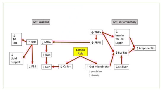 Increasing evidence has shown that gut microbiota plays a role in the development of obesity and MetS through the modulation of energy absorption, and subsequently influences glucose and lipid metabolism [,]. It was recently postulated that gut microbiota producing t10,c12-conjugated linoleic acid induced lipogenesis []. Dietary polyphenols have been found to promote the growth of beneficial bacteria while inhibiting pathogenic bacteria []. In an in vivo study to determine the anti-obesity effect of CA, high-fat-diet (HFD)-induced mice were seen to have a positive effect after being given a daily dose of 50 mg/kg CA for a span of 12 weeks. The researchers noted a significant reduction in body weight and fat accumulation, increases in energy expenditure and beneficial gut bacteria (i.e., Muribaculaceae), and a decrease in pathogenic bacteriae (i.e., Lachnospiraceae) [].
