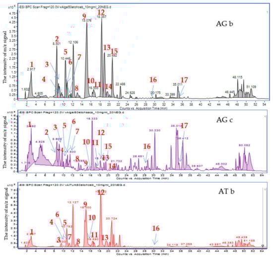 Mass chromatograms recorded in the negative ion mode for 50% ethanol extracts of Kazakhstani bulbs (top: Allium galanthum bulb extract (AGb), Allium galanthum chives extract (AGc), Allium turkestanicum bulb extract (ATb)).