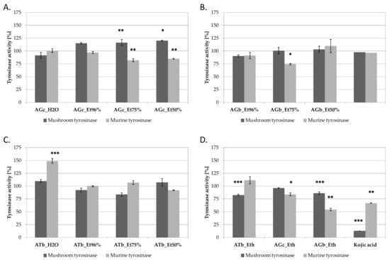 Mushroom and murine tyrosinase inhibitory activity of A. galanthus chives (A) and bulbs (B) (AGc and AGb, respectively), A. turkestanicum bulbs (ATb) (C) and diethyl ether extracts from AGc, AGb and ATb (D) extracts at 100 µg/mL in comparison with 100 g/mL kojic acid; values on graphs represent mean ± SD (n = 3), *** p < 0.001, ** p < 0.01, * p < 0.05.