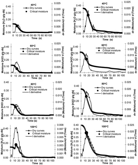 - Derdour, L.; Desmorieux, H.; Andrieu, J. Determination and Interpretation of the Critical Moisture Content (C.M.C.) and the Internal Moisture Content Profile during the Constant Drying Rate Period. Dry. Technol. 1998, 16, 813–824. [Google Scholar] [CrossRef]