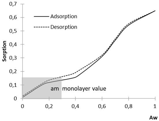 The monolayer capacity or value (am) is an important parameter determined from the water vapour sorption isotherms. That parameter defines the state in which the surface of a product is saturated with a single layer of water vapour molecules, after exceeding which the excess of water contributes to undesirable changes in the product, such as clogging, hardening, loss of flavour or the appearance of foreign flavours and tastes, microbial growth, which corresponds to the critical moisture level [6]. The critical moisture level is a relative value, dependent on the kind and range of changes that we wish to prevent. Knowledge of the capacity of the molecular layer is an important parameter in the choice and design of packaging in terms of water vapour permeability, in the selection of food storage conditions and times, in the determination of the safe level of moisture in multicomponent food systems, in the prediction of the run and of the energy consumption for drying processes or for compaction [7,8]. Knowledge of the run of the process of water vapour desorption for a dried product allows for the determination of the endpoint of drying, as an important parameter both for the attainment of the safe moisture of the product and in relation to the energy requirements of the process [3,4,6,9,10,11,12].