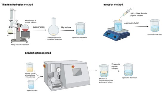 Liposomes vary with composition, size, surface charge, and method of preparation. The main attractive feature in the application of liposomes is that they can accommodate both water-soluble (in the aqueous core region) and lipid-soluble (in lamellae) bioactive compounds [32]. Schematic representations of liposome preparation techniques are shown in Figure 4. These biodegradable and biocompatible compositions of liposomes make them excellent carriers of therapeutic agents. Conventional liposome preparation involves the following stages: drying of lipid/phospholipid ingredients from organic solvents, dispersion in aqueous media (it creates vesicles), purification of the resultant vesicles, and analysis of the final product. Thus, the increasing interest in lipid-based nutraceutical formulation can be correlated with the increasing number of clinical trials. Table 2 summarizes the recent clinical trials on lipid-based formulations. However, the traces of organic solvent residues may remain in the lipid and/or aqueous phase and result in toxicity. Advances in the field of encapsulation technology have brought a possible way to prepare lipid vesicles without volatile organic solvents. It is a remarkable development by Prof. Mozafari to formulate microcapsules without the application of toxic solvents, detergents, and harsh treatments such as sonication/microfluidization [38,39]:
