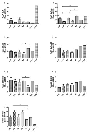 Following enzymatic depolymerization and SAX HPLC, the resulting di-saccharides were separated by the degree and position of sulfate and acetyl modifications (according to reference standards). The degree of sulfation varied between the different lung preparations donors but also differed among individual preparations (see Figure 3 and Table 2). Table 2 shows the disaccharide range distributions of the individual GAG preparations and SAX HPLC runs, with data from a mouse disaccharide composition analysis. In Figure 3A–G, the different disaccharide compositions are shown as mean ± SEM for each donor’s lung. On the one hand, HS isolates of the m70 and f89 donor lungs showed an overall higher degree of sulfation compared with m53, f80, and f92, and they contained rather large amounts of the tri-sulfated disaccharide UA2S-GlcNS6S (59.7% and 58.8%). Moreover, m70 and f89 exhibited an overall lower degree of N-acetylated species (UA-GlcNAc 11.2% and 12.7%) and a lower number of free N-residues (0.6% and 1%). On the other hand, HS preparations of lungs m53, f80, and f92 were distinctly less sulfated. These isolates contained between 28.0% and 39.5% tri-sulfated disaccharides. Compared with the higher sulfated HS isolates, they displayed a higher degree of acetylated HS carbohydrates (0.7% up to 38.0%).