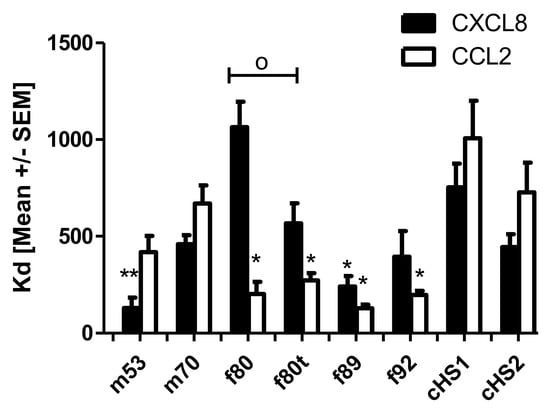 All data shown for IFT are reported as mean ± SEM (standard error of the mean) for n observations. Statistical analysis was performed using Graphpad Prism 5.0 using Student’s t-test comparing individual titrations with the matching cHS1 (CXCL8 and CCL2, respectively). * p < 0.05 and ** p < 0.01 were considered as statistically significant. All measurements were performed in triplicates.