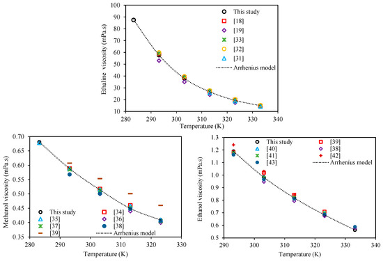 Comparison of the behaviors of the measured viscosities with respect to temperature at atmospheric pressure for Ethaline (1 ChCl:2 ethylene glycol), methanol, and ethanol in this study and literature values (dotted lines are the Arrhenius models, Equation (1)).