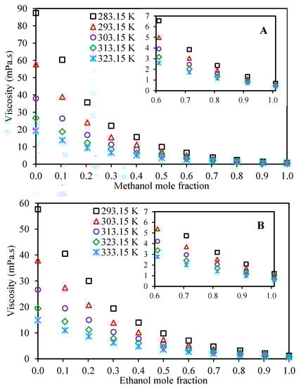 Viscosity behavior of the mixtures with respect to alcohol concentration for the investigated systems at a pressure of 100 kPa ((A): Ethaline (1 ChCl:2 ethylene glycol) + methanol, (B): Ethaline (1 ChCl:2 ethylene glycol) + ethanol).