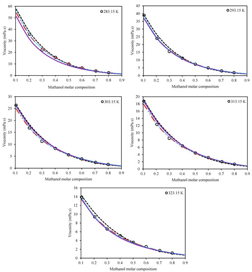 Finally, as expected, the Grunberg–Nissan model, because of its very simple mathematical expression and the least number of adjustable parameters, showed the least reliable results. However, it should be considered that all of the investigated models, according to Table 5 and Figure 3 and Figure 4, generally produced acceptable results and provide good viscosity estimations for both of the investigated systems.