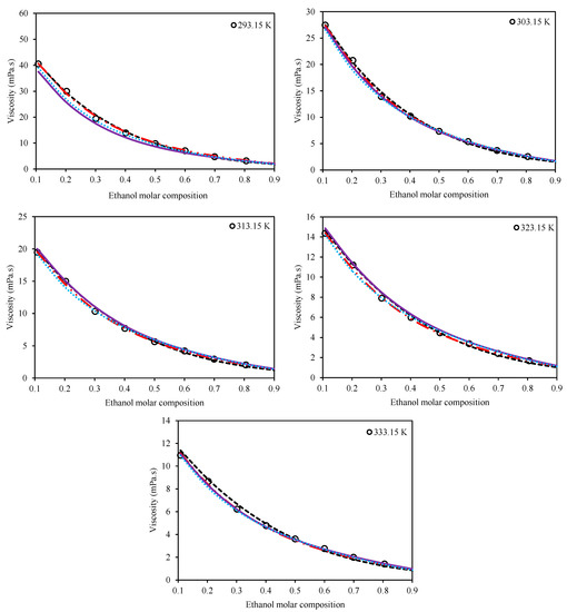 The limited number of studies on the viscosities of DES mixtures with alcohols, in comparison to the large number of introduced DESs, and the importance of alcohols in the chemical industries show the significant gap in the literature on this topic. Therefore, in this study, the viscosity behavior of Ethaline (1 ChCl:2 ethylene glycol), as one of the less viscous and most commonly used DESs, is determined experimentally in mixtures with the two common alcohols of methanol and ethanol over the temperature range of 283.15–333.15 K and at atmospheric pressure. Then, the four well-established models of Grunberg–Nissan [20], Jouyban–Acree [21], McAllister [22] and Preferential Solvation [23,24] were developed according to the experimental measurements. These models can then be considered as practical engineering tools to estimate the viscosities of the investigated mixtures at any composition desired.