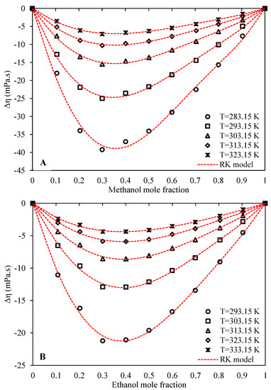 The Redlich–Kister model (Equation (25)) was used to correlate the viscosity deviations with respect to concentration at each investigated temperature. Table 7 presents the optimized values of the Redlich–Kister parameters for both systems.