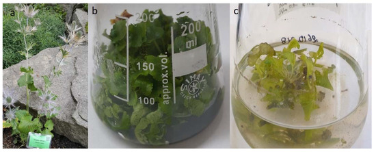 Eryngium alpinum L. (a) soil-grown plant; (b) microshoot culture on solid medium; (c) microshoot culture agitated in liquid medium.