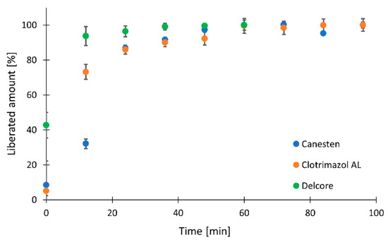The kinetic profiles of all three tested formulations were then compared using longer sampling intervals in three Franz cells repeated twice, and produced six profiles. The average values are displayed in Figure 3. The results are reported as the percentage of liberated clotrimazole for easier comparison and to include all three formulations. Differences between formulations in the first part of the profiles were observed, whereas fast release of clotrimazole was observed for Delcore, followed by Clotrimazol AL, and the slowest release was from Canesten cream. The final concentration was reached in 36 min for all tested formulations.