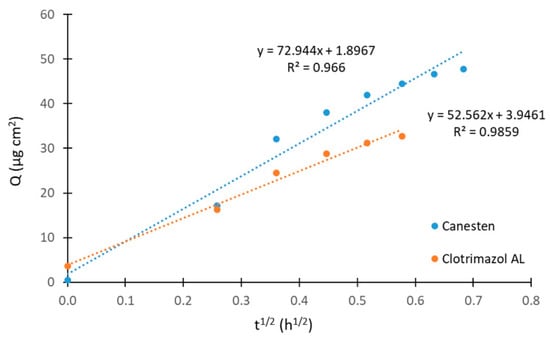 Figure 4 demonstrates a comparison of the overall amount of liberated clotrimazole linearized using Equation (2) for Canesten and Clotrimazol AL formulations when the applied cream amount and the overall content of clotrimazole were at the same levels. The release rates were very similar, with a higher release of clotrimazole from Canesten than from Clotrimazol AL. Additionally, the amount of released clotrimazole was higher for Canesten cream. The plots in Figure 4 were obtained from liberations determined in a single Franz cell, which means at short sampling intervals. The linearized profiles of clotrimazole release for all formulations using three Franz cells experiments are presented in the Supplementary Material, Figure S1.