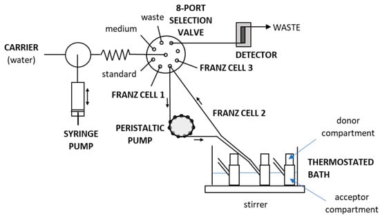 The apparatus for automation of the liberation tests and the tubing configuration are shown in Figure 5, which are based on a MicroSIA system (FIAlab® instruments, Seattle, WA, USA). The miniaturized flow manifold comprised a 5 mL automatic piston pump, a holding coil with an inner volume of 400 µL, and a 6-port selection valve. Fluorinated ethylene propylene 1520 XL tubing with 0.75 mm i.d. were used for all flow conduits. A homemade poly(methyl methacrylate) water bath was used to accommodate up to nine Franz cells. In this study, three one-wall Franz cells made of glass, with an inner volume of 15 mL, were placed in a thermostated bath and connected to a single SIA system in parallel. A thermostat (Julabo Labortechnik GmbH, Seelbach, Germany) maintained the Franz cells at a temperature of 32 °C. The water bath was placed onto a 15-position magnetic stirrer (Variomag Poly 15, ThermoFisher, Pardubice, Czech Republic). Stirring bars 10 mm in length were placed inside the Franz cells to mix their contents at 450 rpm.