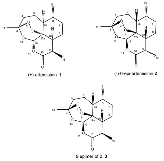 (+)Artemisinin (1), (−)-6-epi-artemisinin (2) and 9 epimer of 2 (3).