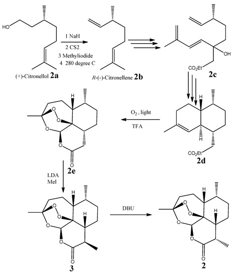 The absolute configuration of compound 2 was established by direct chemical synthesis of (−)-6-epi-artemisinin (2). An efficient chemical synthesis of (−) artemisinin was developed by Krieger et al. [7], and we chose to follow the same chemical synthesis route by a different starting material. We started with commercially available (+)-citronellol (2a), which is of known configuration. We converted this starting material into (R)-(−)-3,7-dimethyl-1,6-octadiene or R-(−)-citronellene (2b) ([α]22.5D −10 (c 0.5, CHCl3), and then used several steps from the Krieger synthesis to successively produce ethyl (6R)-3-hydroxy-6-methyl-3-((E)-3-methylbuta-1,3-dien-1-yl)oct-7-enoate (2c), ethyl 2-((1R,4R,4aR,8aR)-4,7-dimethyl-1,2,3,4,4a,5,6,8a-octahydronaphthalen-1-yl)acetate (2d) and (3S,5aR,6R,8aR,12R,12aR)-3,6-dimethyloctahydro-12H-3,12-epoxy [1,2] dioxepino [4,3-i]isochromen-10(3H)-one (2e) (Figure 4). This latter product was transformed to a new epimer (3) of 2 at C-9 by treatment of 2e with lithium diisopropylamide (LDA) and methyl iodide (MeI). The final step of the route was to convert compound 3 into the final product, (−)-6-epi-artemisinin (2), with the addition of 1,8-diazabicyclo [5.4.0]undec-7-ene (DBU). The 1H and 13C NMR of the natural product and synthetic 6-epi-artemisinin (2) were compared and found to be identical. This was additionally confirmed by mixing 1 mg of the synthetic product 2 with 1 mg of the natural product 2 and observing an identically overlapped 1H and 13C NMR spectra. The absolute configuration of 2 was established as 3S,5aR,6R,8aR,9S,12R,12aS from its opposite sign of optical rotation compared to artemisinin (1), and its identical optical rotation to synthetic 2, [α]22.5D −58.2 (c 0.9, CHCl3)