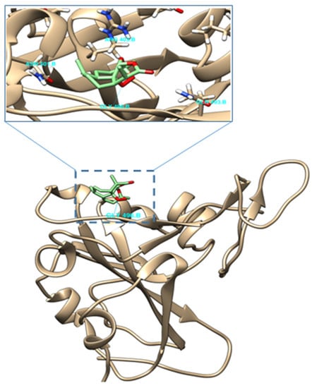 Molecular docking studies of (−)-6-epi-artemisinin (2) demonstrated the presence of a good interaction with the Lys-353 binding hotspot, situated in the receptor-binding motif (RBM), which in turn is present in the receptor binding domain (RBD) of the spike protein (Figure 5). The obtained binding energy (Vina score) in this area was −6.2 kcal/mol, compared to −6.5 kcal/mol for artemisinin [8]. We also notice the presence of hydrogen bonding between one of the oxygens in the peroxy bridge and Gly 496 residue; it is worth noting that such a type of hydrogen bonding was not present in the case of artemisinin. In contrast, molecular docking of this isomer did not show any type of interactions with the Lys-31 binding hotspot of the RBM; this is different to artemisinin which was previously [8] shown to interact with this region of the RBM, albeit at a slightly lower binding energy, 5.6 kcal/mol.