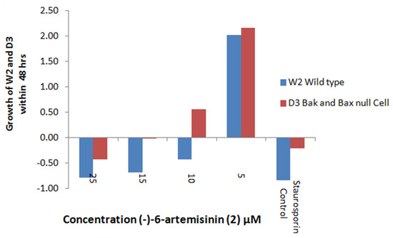 Apoptosis, the naturally programmed cell death, when activated is a natural way to combat any type of cellular damage and malfunctioning. The vast majority of human solid tumors are of epithelial origin, and defects in apoptosis, mostly upstream of Bax and Bak, play important roles in both tumor suppression and mediation of chemotherapeutic response [11]. Apoptosis is hallmarked by the formation of apoptotic bodies, and it is associated with alterations in Bax and Bcl-2 protein expressions. Cancer cells do not have the ability to activate this process. Since (−)-6-epi-artemisinin (2) selectively induces apoptosis by acting solely to cancer cells, as demonstrated by the killing of epithelial cancer cells W2 but not normal Human Mammary Epithelial Cells (HMEC), (−)-6-epi-artemisinin (2) induces apoptosis upstream of Bax and Bak, and it may have potential for use as an antiproliferative agent that exploits the apoptosis pathway in tumor cells.