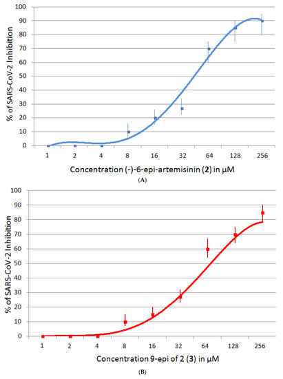 SARS-CoV-2 Inhibitory assay of (−)-6-epi-artemisinin (2) (A) with EC50 = 49 ± 0.32 μM and SARS-CoV-2 inhibitory assay of 9 epimer of 2 (3) (B) with EC50 = 54 ± 0.27 μM.