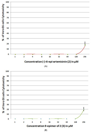 The percentage of cytotoxicity of (−)-6-epi-artemisinin (2) against Vero E6 cells with (A) CC50 > 250 μM and 9 epimer of 2 (3) with (B) CC50 > 200 μM.
