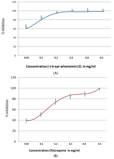 Inhibition of haem polymerization formation by (A) (−)-6-epi-artemisinin (2) (blue) with IC50 = 3.5 ± 0.002 nM and (B) chloroquine (red) with IC50 = 18 ± 0001 nM.