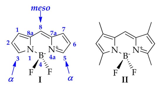 - Prlj, A.; Vannay, L.; Corminboeuf, C. Fluorescence Quenching in BODIPY Dyes: The Role of Intramolecular Interactions and Charge Transfer. Helv. Chim. Acta 2017, 100, e1700093. [Google Scholar] [CrossRef]