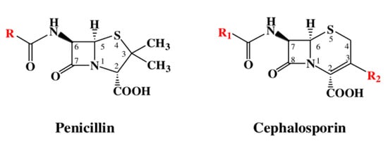 The structures of penicillin and cephalosporin. The β-lactam scaffolds are shown in black, and the different side chain structures of β-lactam are shown as R in red.