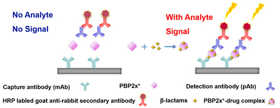 Schematic representation of sandwich immunoassay for small-molecule detection based on PBP2x*.