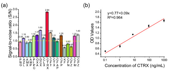 (a) The S/N of the sandwich immunoassay for detection of 18 β-lactams (n = 3). S/N > 1 indicates positive detection by the sandwich immunoassay, while S/N ≤ 1 indicates negative detection. (b) Standard curve of the sandwich immunoassay for CTRX detection (n = 3).