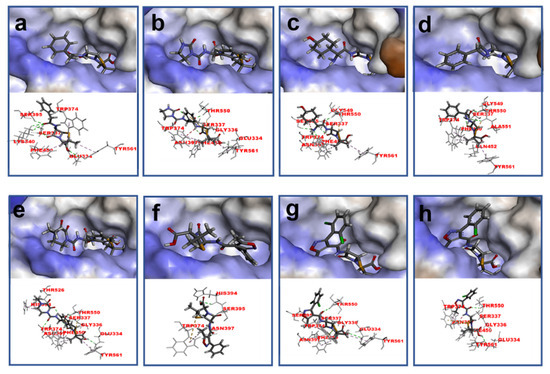 Schematic representation of the interactions between PBP2x* (PDB code: 2z2m) and (a) PNG; (b) AZL; (c) AMX; (d) AMP; (e) PIPC; (f) OXA; (g) DCX; and (h) CLX. Hydrogen bonds are shown as green dashed lines, and hydrophobic interactions are displayed as purple dashes.