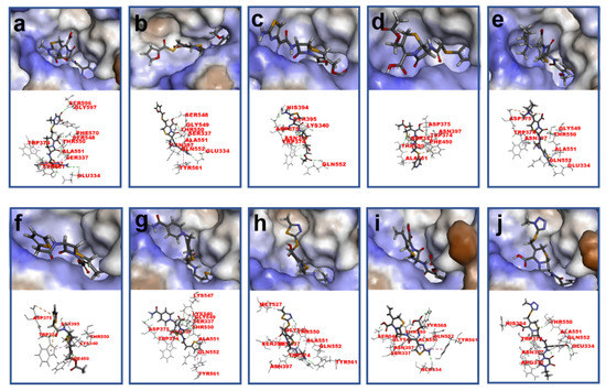 Schematic representation of the interactions between PBP2x* (PDB code: 2z2m) and (a) CTRX; (b) CFT; (c) CTX; (d) CFAP; (e) CFP; (f) KF; (g) CFN; (h) CFZ; (i) CFM; and (j) CPZ. Hydrogen bonds are shown as green dashed lines, and hydrophobic interactions are displayed as purple dashes.