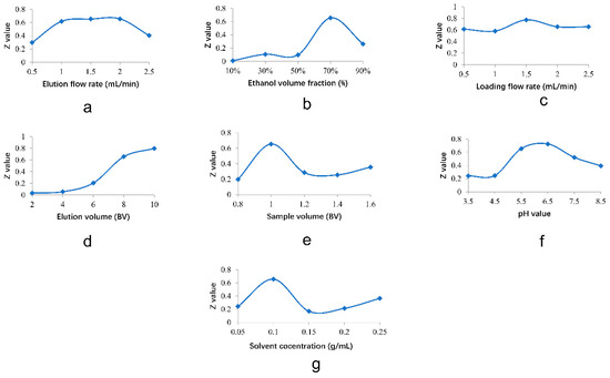 (a): Effect of elution volume flow rate on Z value; (b): effect of ethanol volume fraction on Z value; (c): effect of loading flow rate on Z value; (d): effect of elution volume on Z value; (e): effect of sample volume on Z value; (f): effect of pH value on Z value; (g): effect of extraction solvent on Z value.