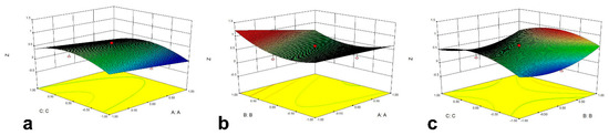 The effect of cross-interaction among pH value (X1), extraction solvent concentration (X2) and ethanol volume fraction (X3) on Z value. (a) response surface plot of effects of the interaction between pH value and ethanol volume fraction on Z value, (b) response surface plot of effects of the interaction between pH value and extraction solvent concentration on Z value, (c) response surface plot of effects of the interaction between extraction solvent concentration and ethanol volume fraction on Z value.
