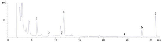 The established fingerprint of Astragali radix. 1-astragaloside V 2-astragaloside IV 3-astragaloside III 4-astragaloside II 5-astragaloside I 6-isoastragaloside I 7-isoastragaloside II.
